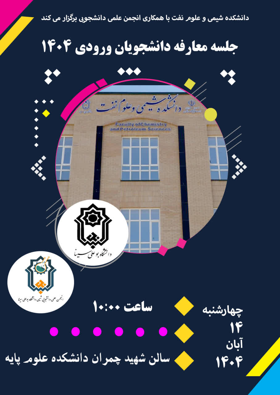 جلسه معارفه دانشجویان ورودی 1404 دانشکده شیمی و علوم نفت با همکاری انجمن علمی دانشجویی، در روز چهارشنبه چهاردهم آبان ماه سال جاری ساعت 10 صبح در محل سالن اجتماعات شهید چمران دانشکده علوم پایه برگزار خواهد شد.
